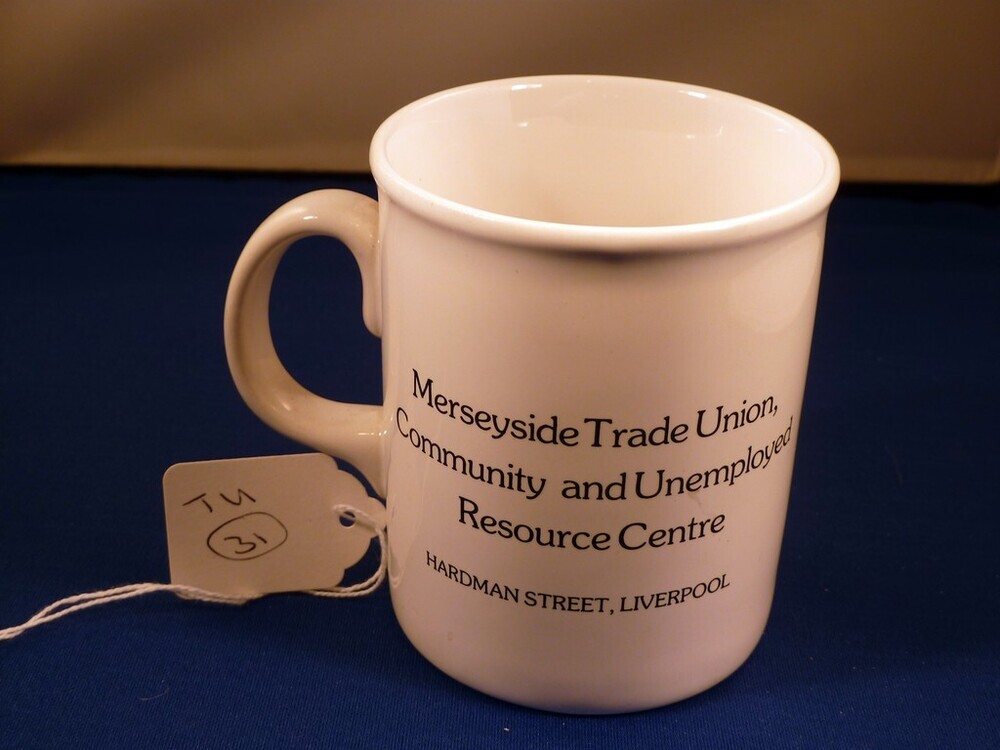 Scope and ContentMerseyside Trade Union, Community and Unemployed Resource Centre mug. Front - Illustration of "Yosser" [from the television programme 'Boys from the Blackstuff'] in front of building with white text - "Giz a job ...and no buts". Back: Text - "Merseyside Trade Union Community and Unemployed Resource Centre. Hardman Street, Liverpool".