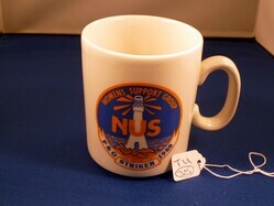Scope and ContentNational Union of Seamen, Womens Support Group mug. Front: Circular badge with a lighthouse on rocks. Text above in yellow - ' Womens Support Group. NUS'. Text below in blue - 'P&O Striker 1988'.