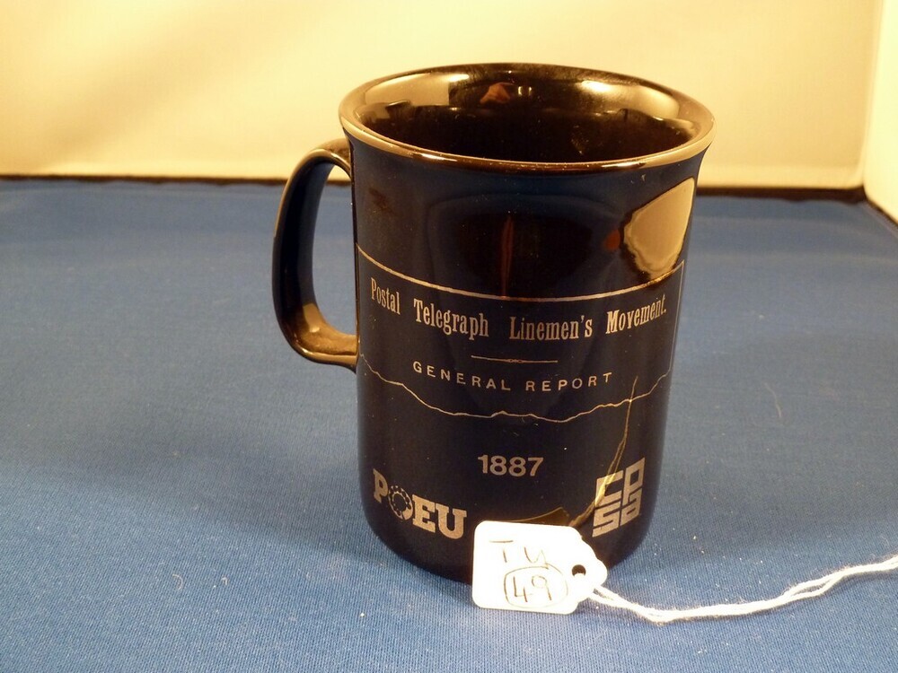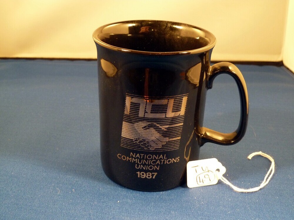 Scope and ContentNational Communications Union mug. Front: Gold stripe with hands clasped. Text above - "NCU". Text below - "National Communications Union 1987". Back: Text - "Postal Telegraph Linemen's Movement. General Report". Text below - "1887 POEU CPSA".