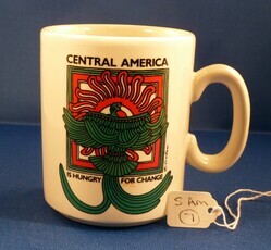Scope and ContentOxfam: Central America is hungry for change mug. Square illustration of a green bird surrounded by red flames. Text - "Central America, is Hungry for Change". Side text - "Oxfam".