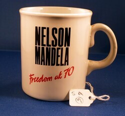 Scope and ContentNelson Mandela Freedom at 70 mug. Front: Text - "Nelson Mandela Freedom at 70" Back: Text - "Free Namibia! Free South Africa! Sanctions now!" Side: Text - "Anti Apartheid Movement" and logo.
