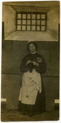 Scope and ContentPhotograph of Emmeline Pankhurst in a studio mock prison. Photograph called "In Bondage".