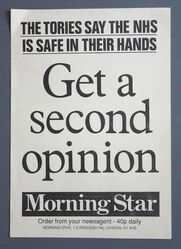 Scope and ContentPoster with the text; The Tories say the NHS is safe in their hands, Get a second opinion. Produced by the Morning Star.