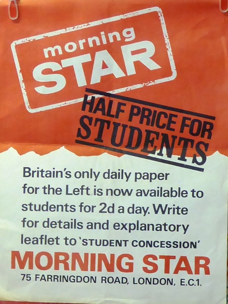Scope and ContentPoster with the text: Morning Star, half price for students. Britain's only daily paper for the left is now available to students for 2d a day. Write for details and explanatory leaflet to Student concession. Produced by the Morning Star.