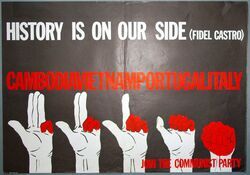 Scope and ContentPoster with the text: History is on our side (Fidel Castro). Cambodia Vietnam Portugal Italy. join the Communist Party. Produced by the Communist Party.