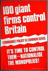 Scope and ContentPoster with the text: 100 giant firms control Britain. Communist Policy is common sense. It's time to control them - nationalise the monopolies. Published by the Communist Party.