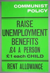 Scope and ContentPoster with the text: Communist Policy. Raise unemployment benefits £4 a person, £1 each child. Rent allowance. Issued by the Communist Party.