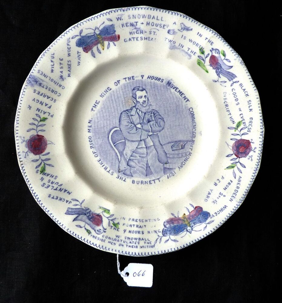 Scope and ContentPlate to celebrate Burnett, the King of the nine hours movement. Illustrated with an image of John Burnett and images of birds, butterflies and roses. There is text around the image of Burnett reading: Burnett. The King of the nine hours movement. The strike of 7500 men commenced Whit Monday 1871. Other text on the plate reads: In presenting a portrait of the 9 hours King W Snowball congratulates the Tyneside men on their victory. W Snowball, Kent House, High St., Gateshead. A [bird] in the [hand] is worth two in the [bush]. Wilful waste makes woeful want. Black silk dress goods of every description. Aberdeen winceys from 2d to 1/6 per yard. Jackets, mantles, furs and shawls. Plain and fancy scarfes, corsets and crinolines