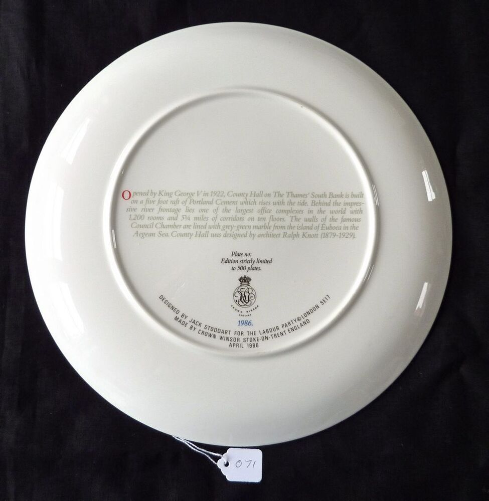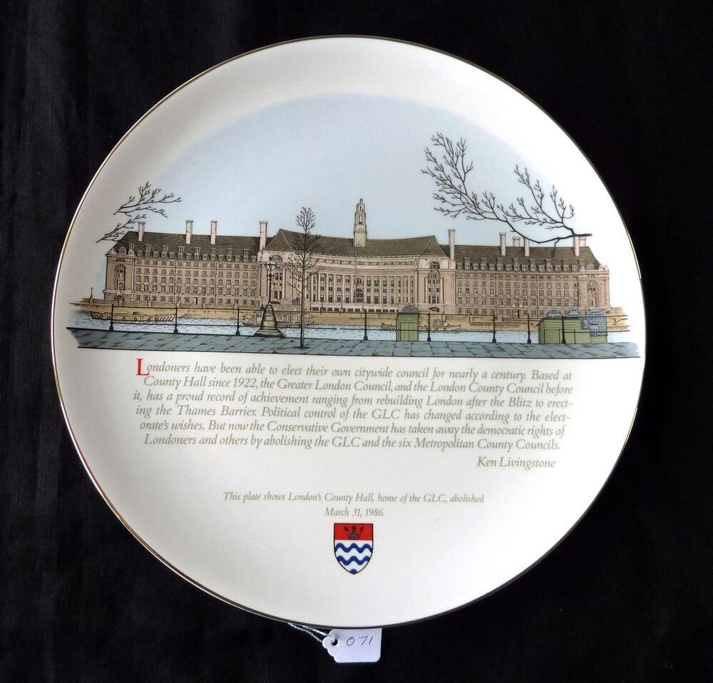 Scope and ContentPlate to commemorate the abolition of the Greater London Council (GLC) in 1986, with an image of County Hall
