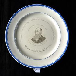Scope and ContentPlate to celebrate the passing of the Manchester Ship Canal Bill in Parliament. Illustrated with an image of Daniel Adamson and the text: Daniel Adamson esq. JP, CE. Chairman of Provisional Committee. Manchester Ship Canal Bill. Royal assent August 8th 1885. Eccles and Patricroft demonstration. Ox roasted August 31st 1885