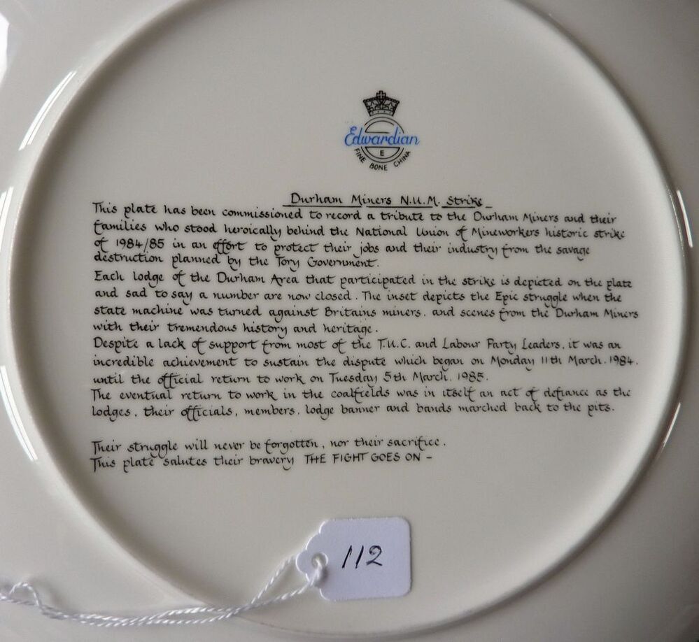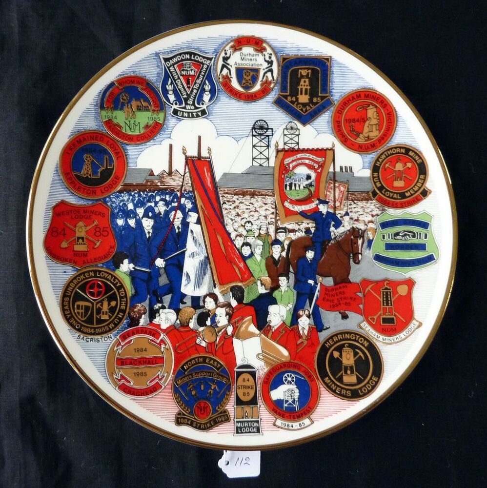 Scope and ContentPlate to commemorate the miners strike in the Durham Area with an image of a heavily policed demonstration in the centre and union branch logos round the rim