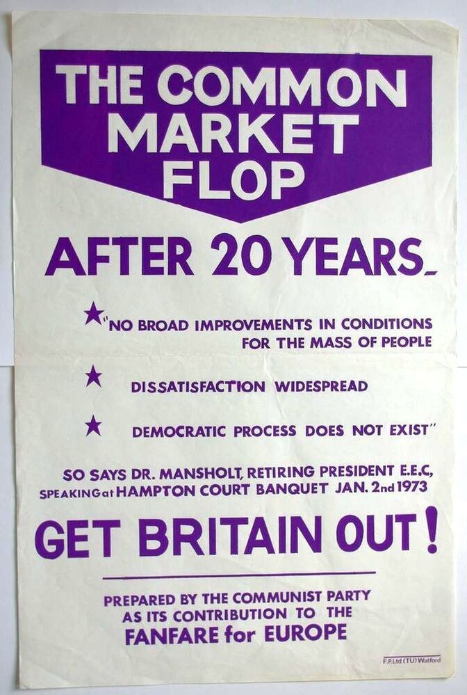 Scope and ContentPoster with the text: The Common Market flop. After 20 years "no broad improvements in conditions for the mass of people, dissatisfaction widespread, democratic process does not exist" so says Dr Mansholt, retiring president EEC speaking at Hampton Court banquet Jan 2nd 1973. Get Britain out!. Prepared by the Communist Party as its contribution to the Fanfare for Europe.