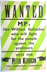 Scope and ContentPoster with the text: Wanted MPs like William Gallacher who will fight for the people against the profiteers. Vote for Peter Kerrigan the Communist candidate.'