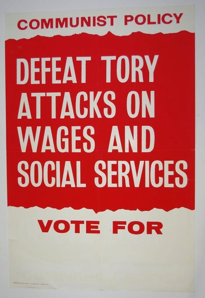 Scope and ContentPoster with the text: Communist policy - defeat Tory attacks on wages and social services. Produced by the Communist Party of Great Britain.