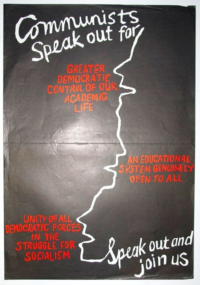 Scope and ContentPoster with the text: Communists speak out for grerater democratic control of our academic life, an educational system genuinely open to all, unity of all democratic forces in the struggle for socialism. Speak out and join us. Produced by the Communist Party.