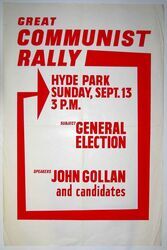 Scope and ContentPoster advertising a Communist Party rally on Sun Sep 13 in Hyde Park, London. Produced by the Communist Party.
