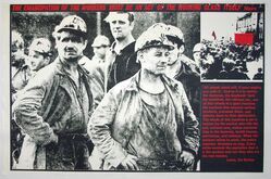 Scope and ContentPoster with the text: The emancipation of the workers must be an act of the working class itself, Marx. Also a long quote from Lenin, On strikes with images of a mass meeting of workers and a group of miners