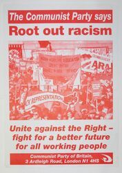 Scope and ContentPoster with and image of a demonstration and the text: The Communist Party says root out racism. Unite against the Right - fight for a better future for all working people Produced by Communist Party of Britain.