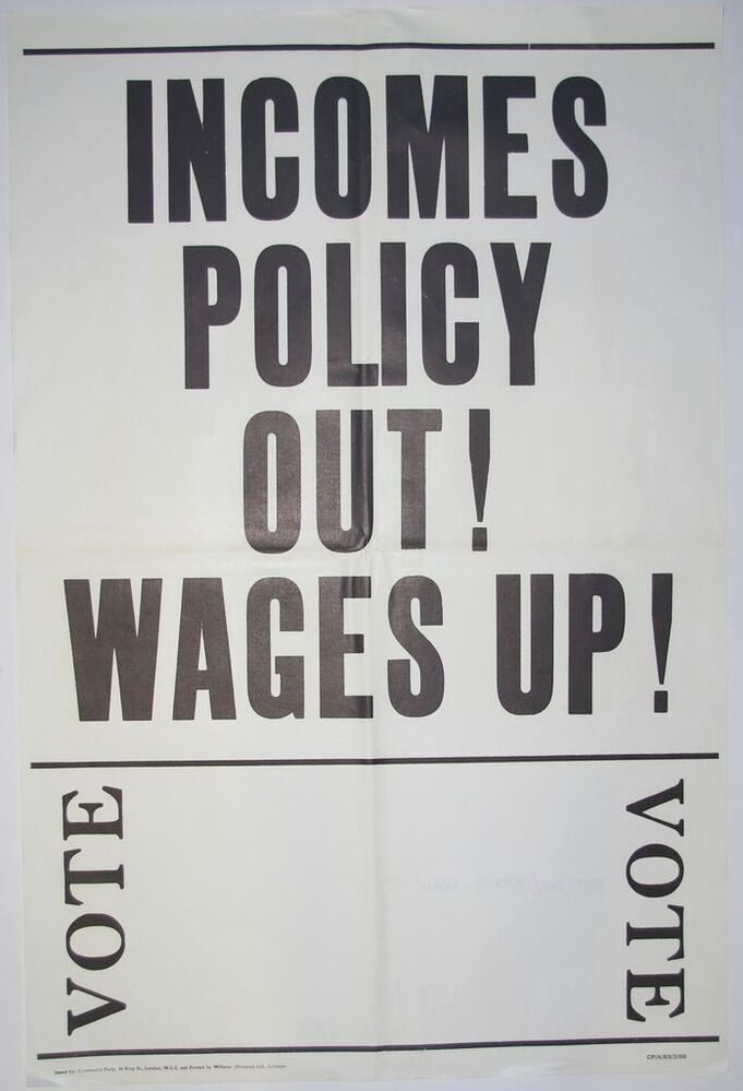 Scope and ContentPoster with the text: Incomes policy out! Wages up!'. Issued by the Communist Party.