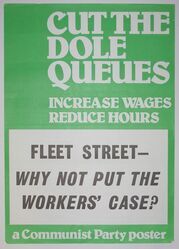 Scope and ContentPoster with the text: Cut the dole queues, increase wages, reduce hours. Fleet Street - why not put the workers' case? a Communist Party poster.