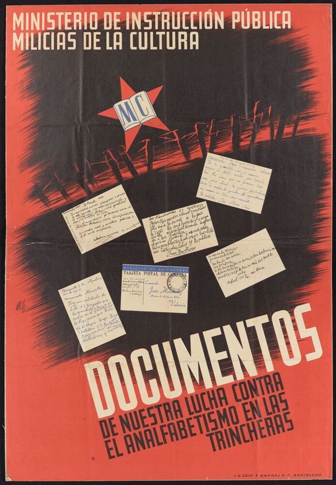 Scope and ContentPoster with images of various documents and the text: Ministerio de Instruccion Publica Milicias de la Cultura. Documentos de nuestra lucha contra el analfabetismo en las trincheras' issued by the Ministry of Public Instruction