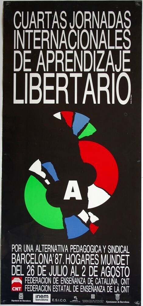 Scope and ContentPoster with the text: Cuartas jornadas internacionales de aprendizaje libertario. Por una alternativa pedagogica y sindical. Barcelona '87. Hogares mundet del 26 del Julio al 2 de Agosto. Produced by CNT