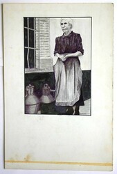 TitleSpanish Civil War: Black and white drawing of woman stood by window with milk churns by Syd Booth