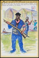 Scope and ContentWatercolour by Syd Booth after SIM XXXVI with the text - Ever since he reached man's estate he has been handling the shovel.  Day after day on the footplate of the locomotive he has been feeding fuel into the maws of the hungry furnace. His life was one of clockwork regularity - then one day it changed. A shot halted his iron horse - he changed the shovel for a rifle and left to defend the rights of his people.
