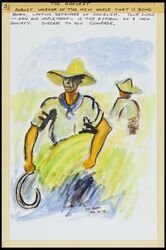Scope and ContentWatercolour by Syd Booth after SIM XXXVI with the text - Robust worker of the new world that is being born, lasting defender of socialism. Your sickle - arm and implement - is the symbol of a new society. Success to you comrade