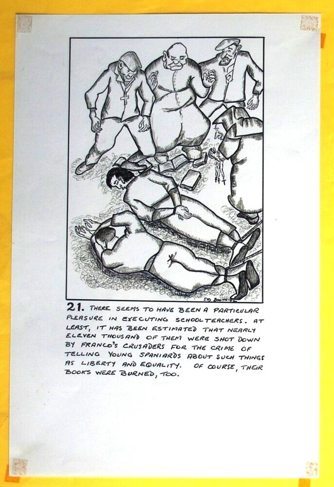Scope and ContentLine drawing by Syd Booth with the text - 21. There seems to have been a particular pleasure in executing school teachers. At least, it has been estimated that nearly eleven thousand of them were shot down by Franco's crusaders for the crime of telling young Spaniards about such things as liberty and equality. Of course, their books were burned, too.