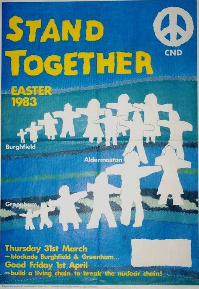 Scope and ContentPoster with an image of cut-out figures on a knitted background and the text: Stand together. Easter 1983. Thursday 31st March - blockade Burghfield and Greenham. Good Friday 1st April - build a living chain to break the nuclear chain!