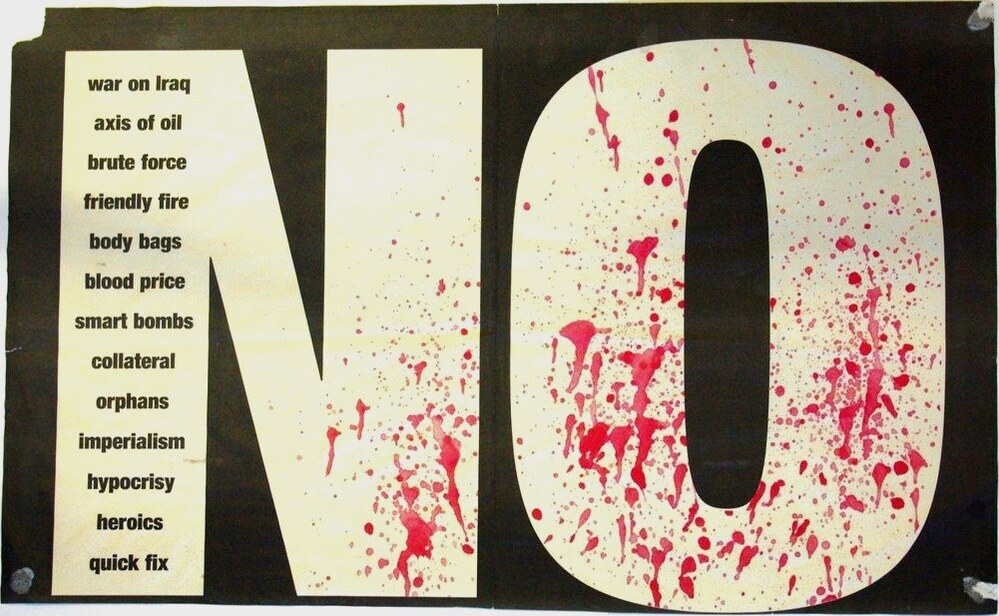 Scope and ContentPoster with the taext: No war on Iraq, axis of evil, brute force, friendly fire, body bags, blood price, smart bombs, collateral, orphans, imperialism, hypocrisy, heroics, quick fix.