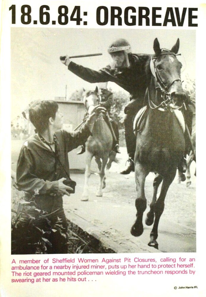 Scope and ContentPoster with an image of a mounted police officer about to hit a woman with a baton and the text: 18.6.84: Orgreave. A member of Sheffield Women Against Pit Closures, calling for an ambulance for a nearby injured miner, puts up her hand to protect herself. The riot geared mounted policeman wielding the truncheon responds by swearing at her as he hits out ...