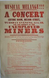 Scope and ContentPoster with the text: Musical melange!!! The public are respectfully informed that a concert will be given in the Lecture Room, Nelson Street on Tuesday Evening, Aug 13, for the benefit of the unemployed miners of Northumberland and Durham. And giving details of the programme, tickets and admissions