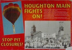 Scope and ContentPoster with images of a ballon with a No pit closures banner and a protest outside a pit and the text: Houghton Main fights on! On 13th October 1992, the Government announced plans to close 31 pits, including Houghton Main in South Yorkshire. The Houghton Main Women Against Pit Closures camp was set up on 13th January 1993, one of seven women's pit camps seeking to defence jobs and mining communities and campaigning for a sane and long-term energy policy. On of the highlights of the camp's activities came on 5th March 1993, when women from the camp took off in a balloon on the eve of the ballot for industrial action by the NUM and NACODS. On 26th March 1993, local schoolchildren protested against pit closures, displaying placards, each bearing the name of one of the 125 pits closed since 1985