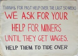 Scope and ContentHandwritten poster with the text: Thanks for past help over the last 50 weeks. We ask for your help for miners until they get wages. Help them to tide over.
