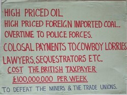 Scope and ContentHandwritten poster with the text: High priced oil. High priced foreign imported coal. Overtime to police forces. Colossal payments to cowboy lorries, lawyers, sequestrates etc. Cost the British taxpayer £100,000,000 per week. To defeat the miners and the trade unions.