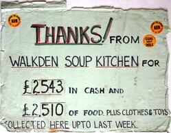 Scope and ContentHandwritten poster with the text: Thanks! from Walkden soup kitchen for £2543 in cash and £2510 of food plus clothes and toys collected here up to last week.