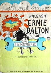 Scope and ContentPoster with a cartoon of a dog breaking through a wall with a spanner in its mouth and the text: North West Spanner unleash Ernie Dalton as I am mongrel