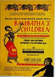 Scope and ContentPoster - In solidarity with the Sarmcol Workers' Co-operative in dispute since May 1985 with giant UK company BTR. Theatre direct from Howick South Africa. Bambatha's Children - the long march from the 1906 poll tax rebellion. Presented by SAWCO (Sarmcol Workers' Co-operative) in association with the National Union of Metal Workers of South Africa and TUC (UK)