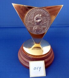Scope and ContentMetal trophy on wooden base depicting the badge of the International Brigades. Presented to Joe Norman, British Battalion by anti-fascists in East Germany