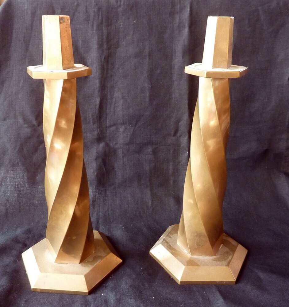 Scope and ContentPair of brass candlesticks to commemorate Bob Wright MFP NJC 1968-1976. Made by Perkins Apprentices