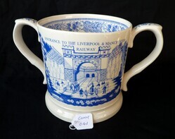 Scope and ContentTwo handled mug commemorating the opening of the Liverpool and Manchester Railway. Front - Image of the Liverpool and Manchester railway entrance. Rear - Image of a train with a passenger carriage and freight carriage
