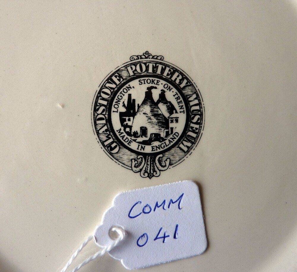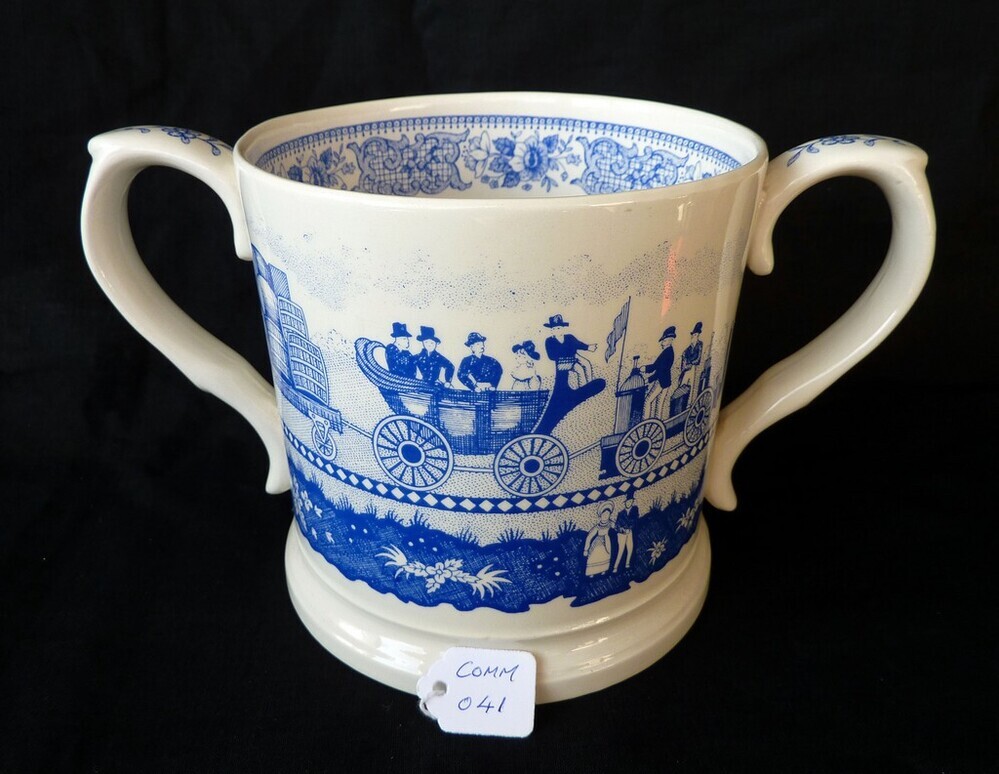 Physical descriptionDimensions (Height x Base x Rim): 120mm x 124mm x 120mm.Shape: Two handled fluted cup; Colour: Blue text and image; Manufacturer: Gladstone Pottery Museum