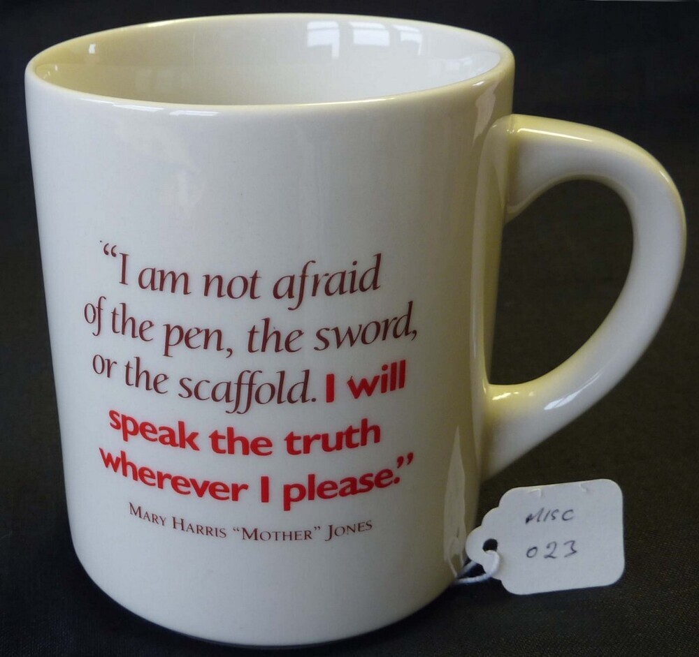 Scope and ContentMug with the quote 'I am not afraid of the pen, the sword or the scaffold. I will speak the truth wherever I please' by Mary Harris "Mother" Jones