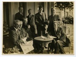 Scope and ContentPhotograph of eight men outdoors around a small table, including Pat Dollan (Scotland), FW Jowett, Campbell Stephen, David Kirkwood, Percy Williams, Francis Johnson, Fenner Brockway and Elijah Sandham