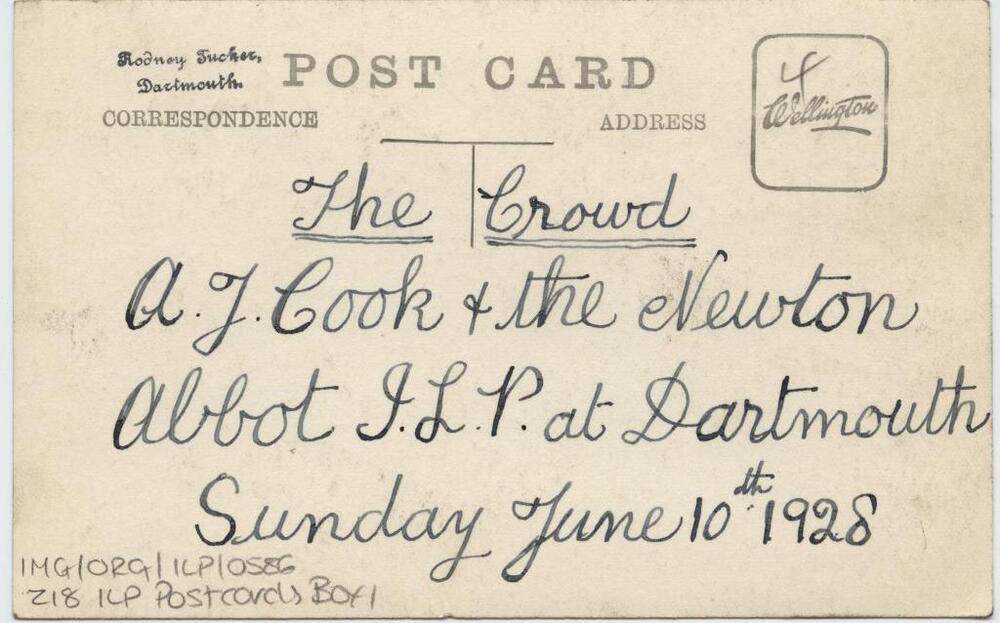 Scope and ContentPostcard of a crowd of people, with the caption 'The crowd. AJ Cook and the Newton Abbot ILP at Dartmouth, Sunday June 10th 1928' on reverse