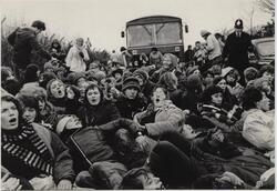 Scope and ContentBlank postcard showing the blockade of gate 6 at USAF Greenham Common on 18 December 1982 as workers arrive by bus to build Cruise missile silos.