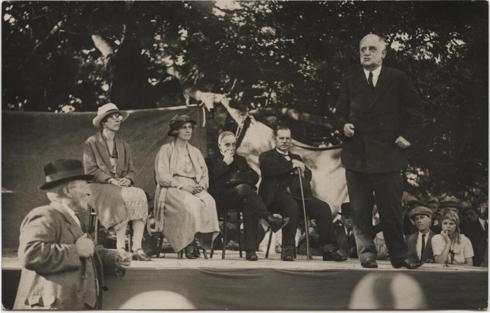 Scope and ContentBlank postcard showing George Lansbury on an outdoor stage, speaking, with four others seated behind him