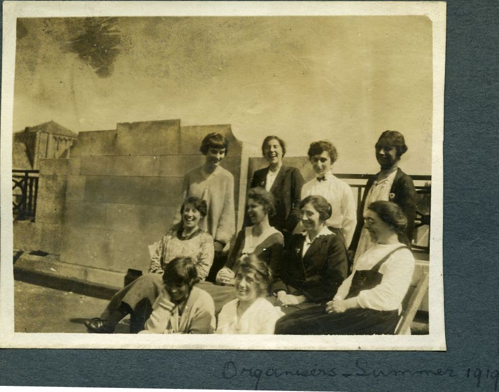 Scope and ContentFormal outdoor portrait of ten women, including [..] Brownhill, [..] Elliott, [..] Bunfoot, Mrs Holloway, Mac Murray, Mrs Burton, Mrs Coombes, Mrs Bray, Mrs Lister and Miss Donoghue, probably on the roof of Dilke House, Malet Street, London [Head office of the National Amalgamated Union of Shop Assistants, Warehousemen and Clerks]